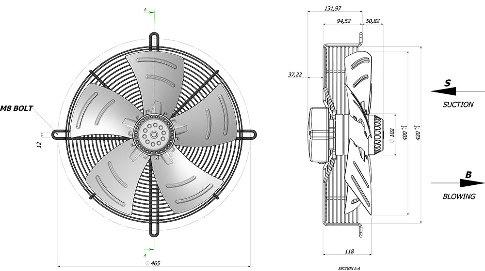 - Product can be produced with suction/blowing air flow direction and single-phase/three-phase motor options.